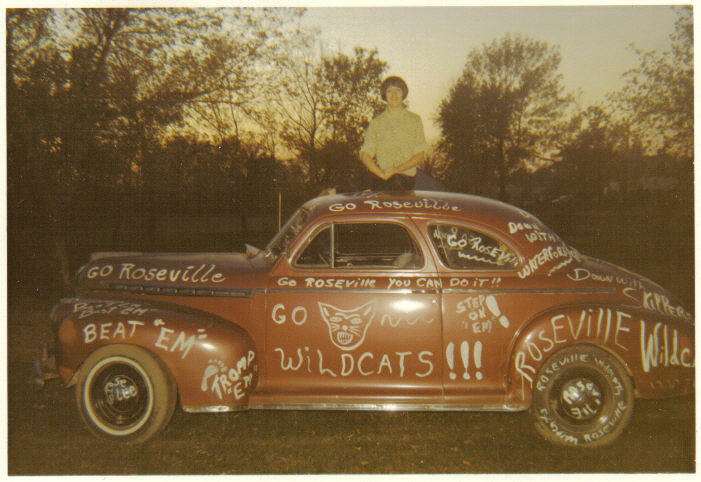 Homecoming Parade - Linda Schimmel sitting/standing on Ralph Fuller's 1941 Chevy.